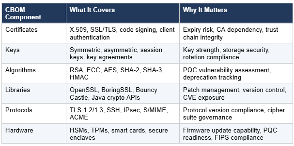 A comprehensive CBOM captures multiple categories of cryptographic information, along with the relationships and dependencies between them. The table below summarises the core components: